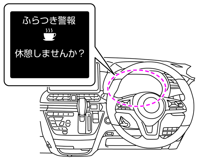 車速約60km/h以上で走行中、運転者のハンドル操作から注意力が低下していると判断したときに、警報音(ブザー)とともにアドバンスドドライブアシストディスプレイに「休憩しませんか?」と警告メッセージを表示します。
