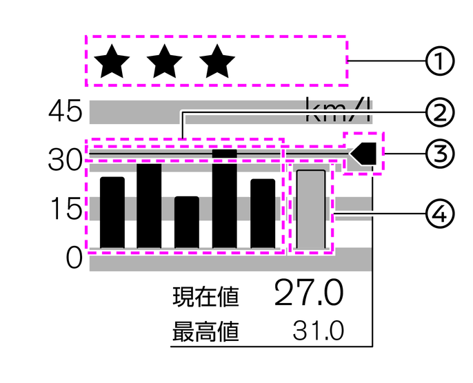 現在値が最高値を上回ると、キースイッチ(電源ポジション)をOFFにしたときに、「ベスト燃費を更新しますか?」と表示します。