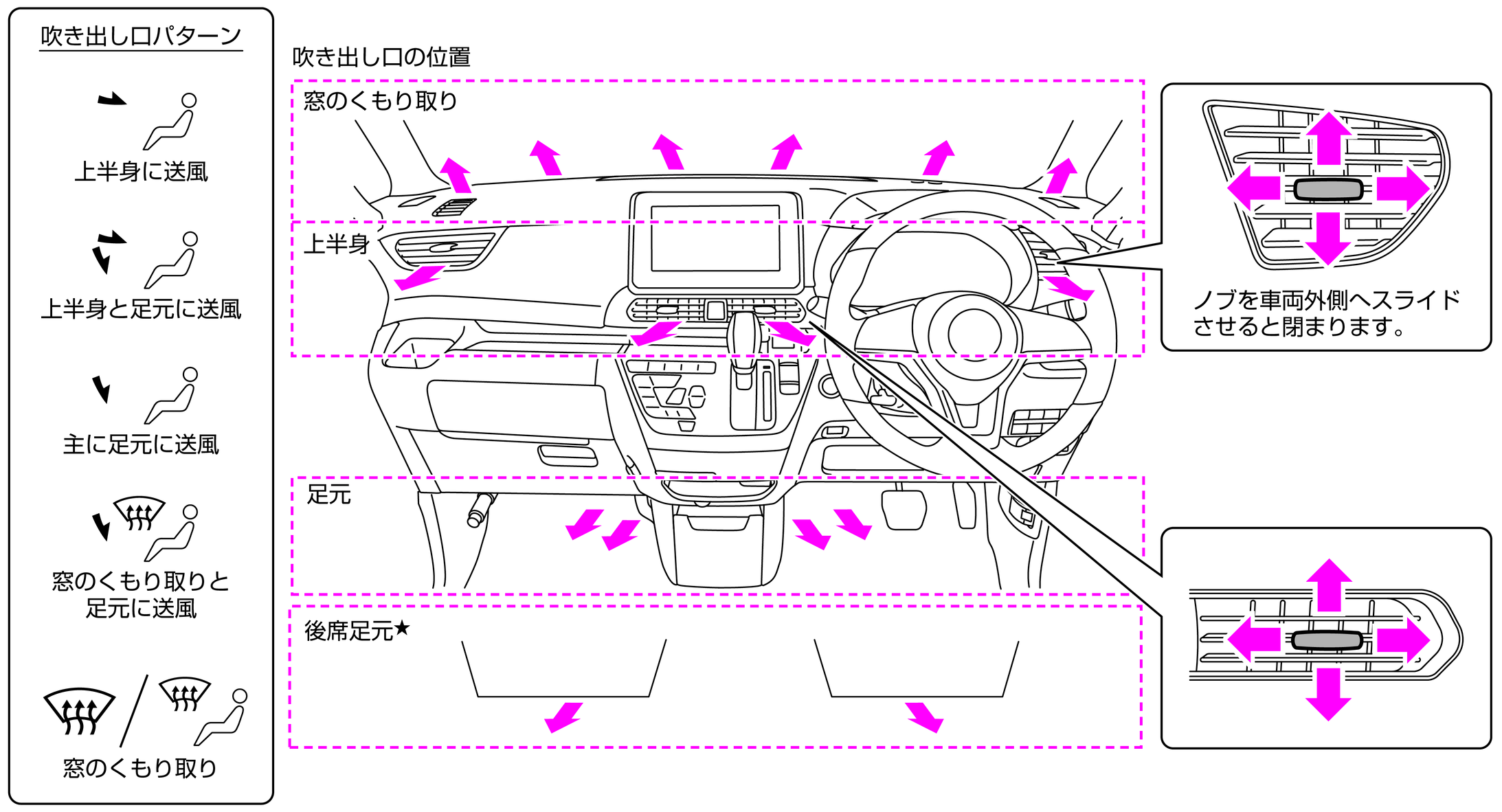 オートエアコン付車は、吹き出し口切り替えスイッチまたはデフロスタースイッチをタッチするごとに吹き出し口が切り替わります。マニュアルエアコン付車は、吹き出し口切り替えダイヤルを回すと吹き出し口が切り替わります。