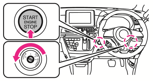 キースイッチを左側に回す、またはエンジンスイッチを1回押すと、エンジンが停止します。