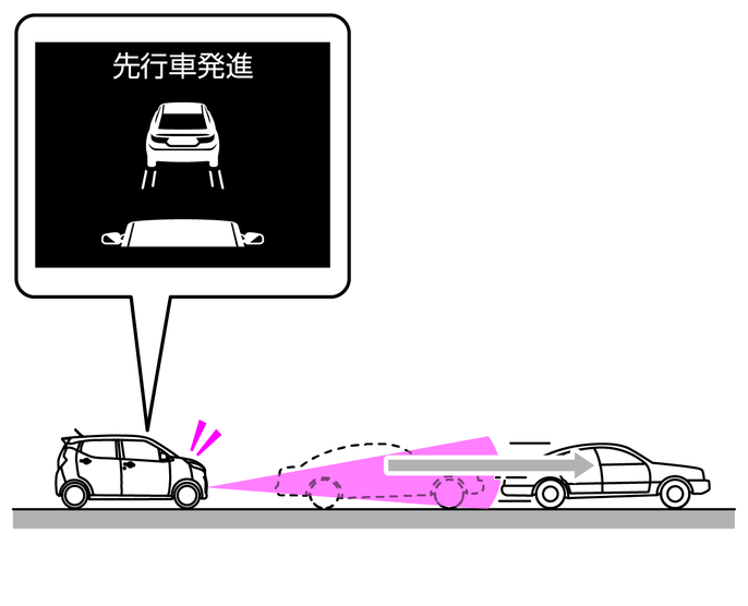 自車と先行車が停止したあと、先行車が発進しても自車が停止し続けた場合に、ブザー音とアドバンスドドライブアシストディスプレイの表示でお知らせします。
