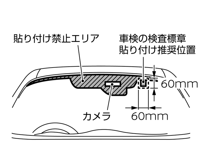フロントガラスに車検の検査標章(ステッカー)を貼り付ける場合は、貼り付け禁止エリアを避けて貼り付けてください。貼り付け推奨位置は、フロントガラスのプリント上側コーナー部を起点とした範囲です。