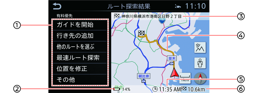 探索条件に応じたルートをそれぞれ表示します。到着予想時間、走行距離などを表示します。 |
