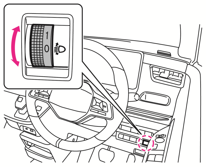 ヘッドランプが下向きのとき、ダイヤルを回して調節します。