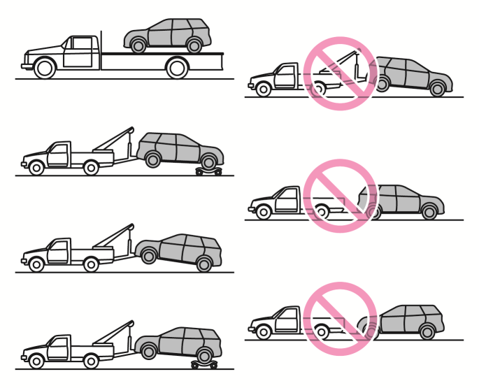 4輪接地でけん引してもらうときは、速度30km/h以下で路肩に寄せる程度の移動のみとしてください。