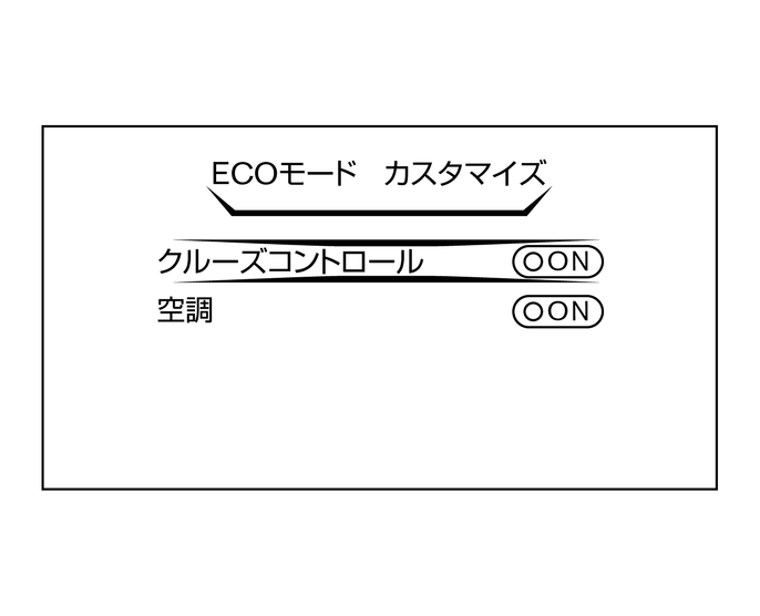 」⇒「画面カスタマイズ」⇒「ECOモード カスタマイズ」を選択すると、ECOモード時の燃費重視機能のON・OFFを切り替えることができます。