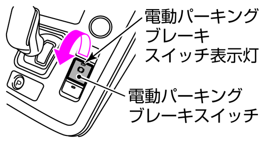 スイッチを引き上げると、電動パーキングブレーキスイッチの表示灯が点灯し、メーター内の電動パーキングブレーキ警告灯(赤色)