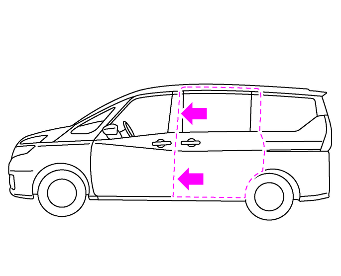 スライドドアを閉めるときは、スライドドアや車体側に手を触れていたり、ドアグリップを握らない。また、スライドドアのふちやその周辺に手をかけない。