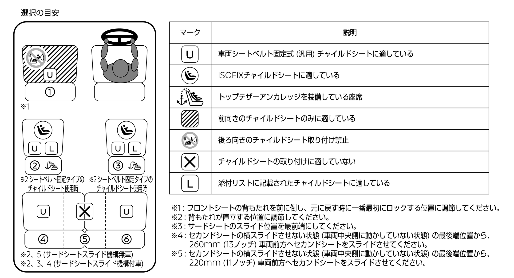 チャイルドシートの取り付け位置により、使用できるチャイルドシートが異なります。