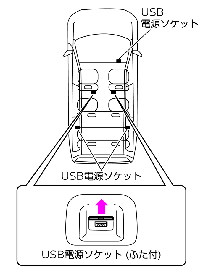運転席シートと助手席シート背もたれの裏側にあるUSB電源ソケットは、ふたを開けて使います。