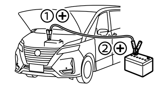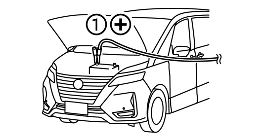 手順3で接続したケーブルの反対側(2)を救援車の12Vバッテリーの⊕端子に接続します。