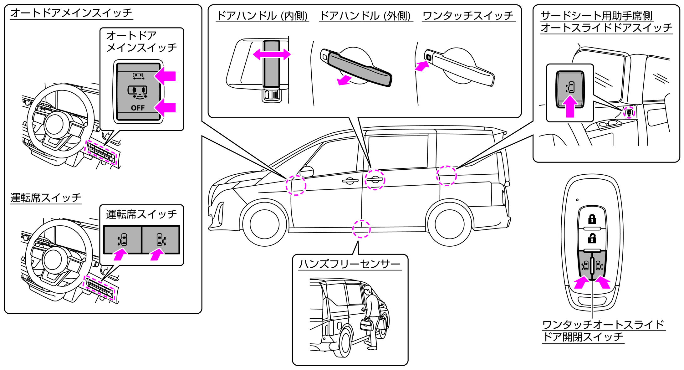 オートスライドドアは、オートドアメインスイッチがOFF以外のとき、次の方法でスライドドアを自動的に開閉できます。