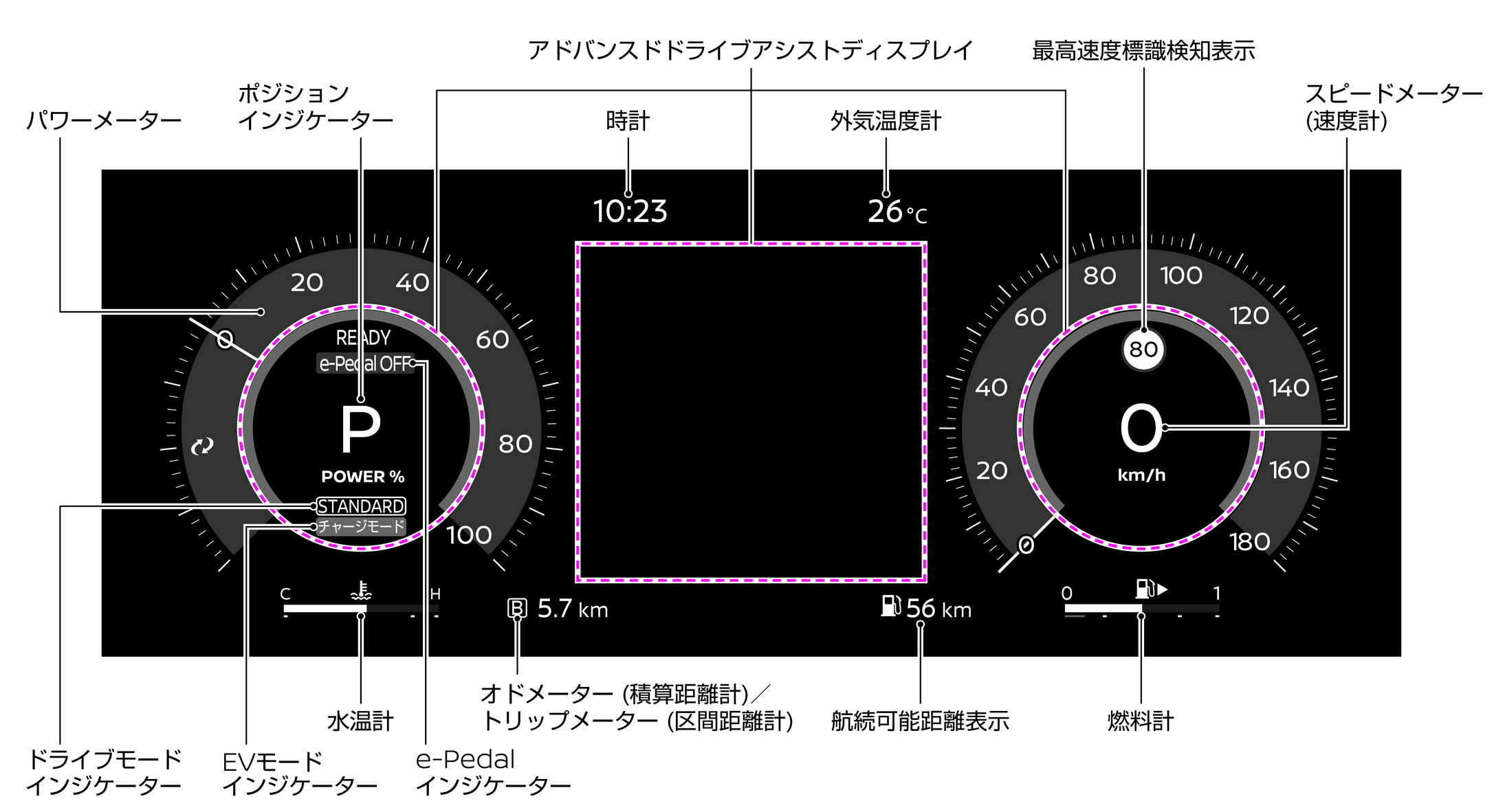 パワースイッチをONにすると、計器類が表示されます。パワースイッチがONのとき、ステアリングスイッチのスイッチでメーター画面モード変更を選択し、OKスイッチを押すと表示画面が切り替わります。なおメーター表示は、クラシック表示とエンハンス表示の2種類あります。