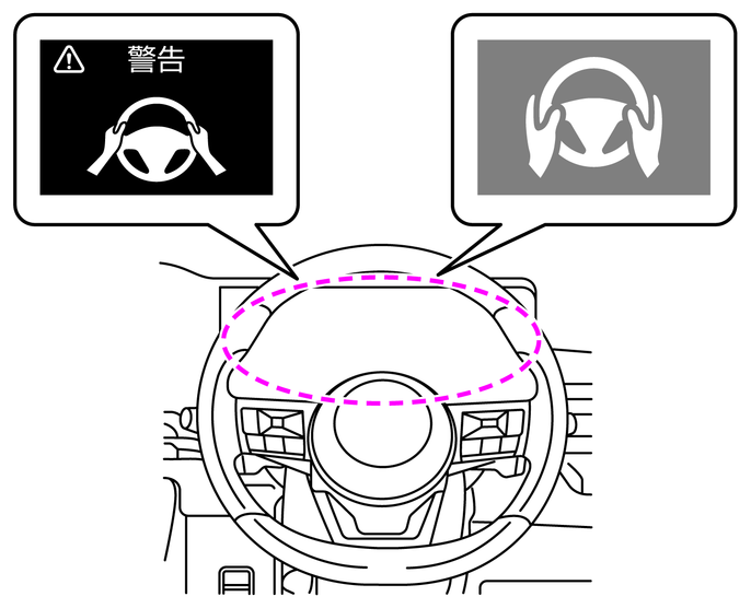 運転者がハンドルを持っていない、または操作していない場合、アドバンスドドライブアシストディスプレイに手放し警告が表示されます。