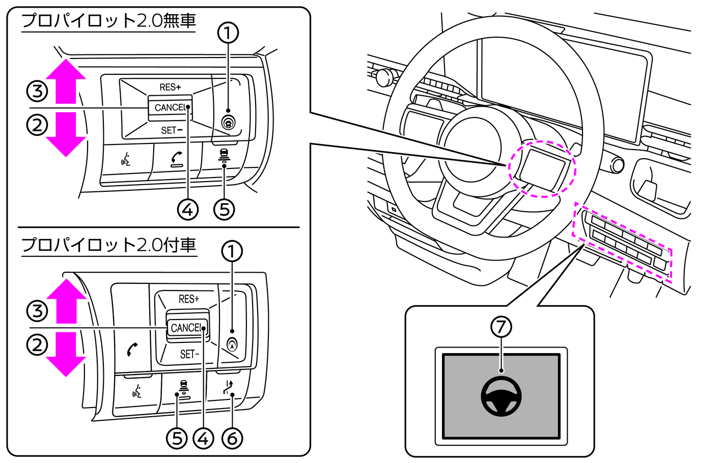 SET-方向に押したときの車速でプロパイロットを開始できます。
