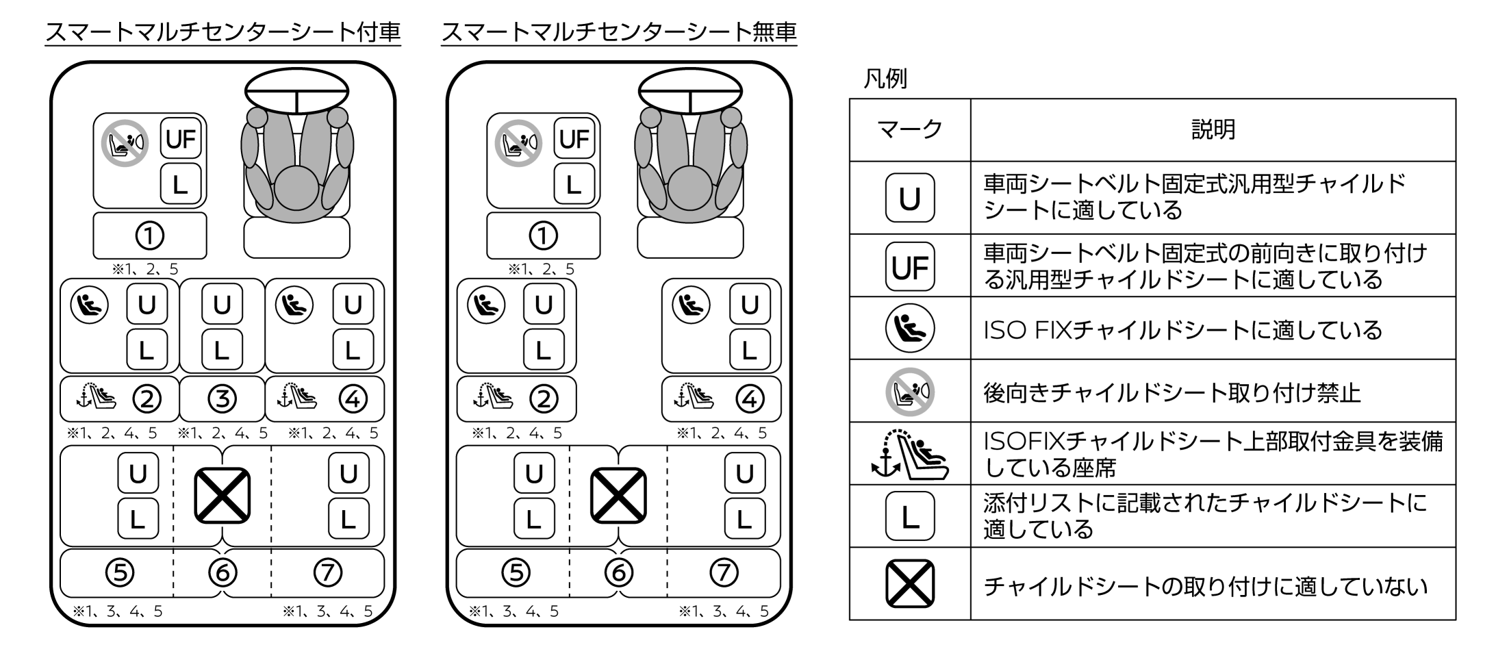 チャイルドシートの取り付け位置により、使用できるチャイルドシートが異なります。