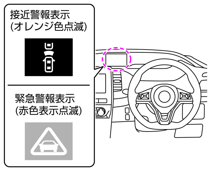 衝突するおそれがあると判断すると、警報音(ブザー)とともにメーター内のインテリジェント エマージェンシーブレーキ表示(接近警報表示)がオレンジ色に点滅します。