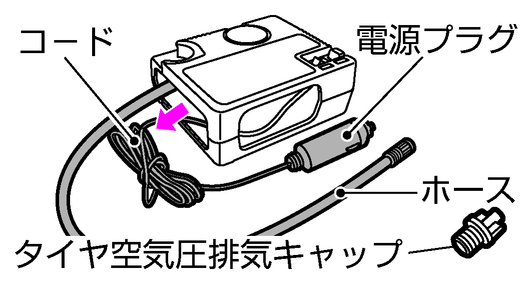 コンプレッサーからタイヤ空気圧排気キャップ、ホース、電源プラグを取り出します。