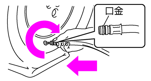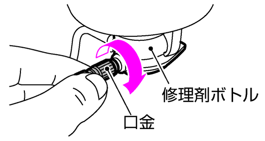 コンプレッサーからのホースの口金を修理剤ボトルにしっかりとねじ込みます。