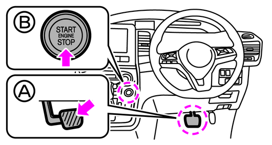 ブレーキペダル(A)をしっかりと踏み込みながら、エンジンスイッチ(B)を1回押します。
