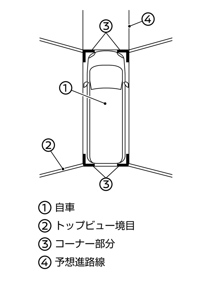 電源ポジションをONにし、初めてトップビューを表示すると、トップビュー境目(2)と表示されないコーナー部分(3)は、約4秒間黄色で強調表示されます。フロント&バックソナーがOFFのとき、表示されないコーナー部(3)は赤色で表示されます。