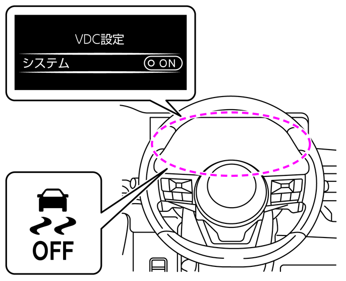 VDC機能をOFFにすると、VDCのすべての機能と、次の機能が停止します。(ABS機能およびブレーキLSD機能を除く)