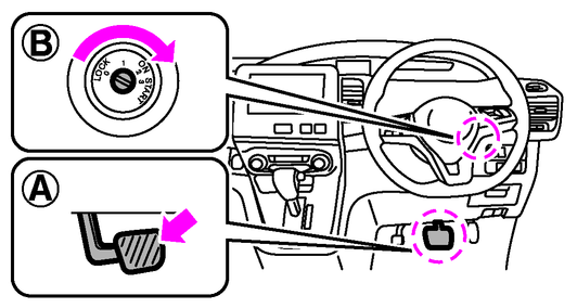 ブレーキペダル(A)をしっかりと踏みながら、キースイッチ(B)をSTARTまで回します。