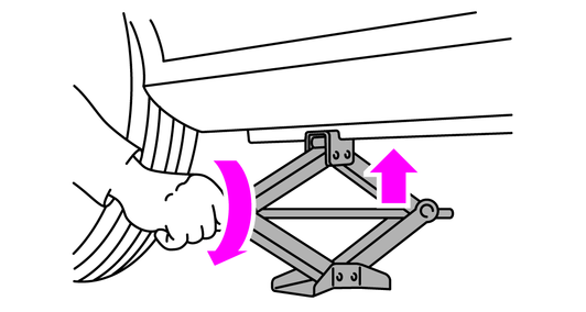 ジャッキの上部がジャッキアップポイントに接触するまで、ジャッキを矢印の方向に手で回します。