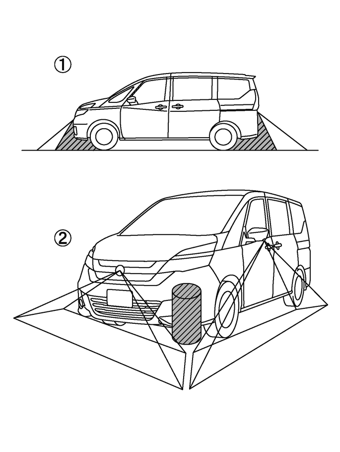 特定の領域は、カメラに映し出されません。フロントビューまたはリヤビューでは、バンパー下側または地上面の部分は表示されないことがあります(1)。トップビューではカメラの映し出す範囲の境目付近にあるもの、路面より高さのあるものは表示されないことがあります(2)。