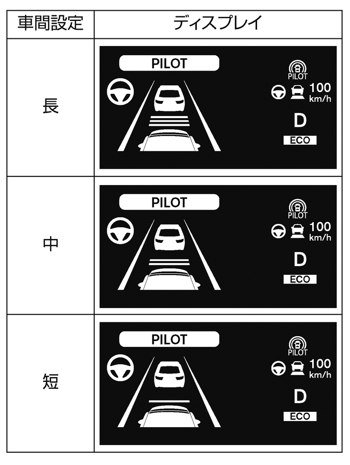 先行車との車間距離を交通状況に応じて選ぶことができます。インテリジェントクルーズコントロール制御中またはセット待機状態のときに車間設定を切り替えることができます。