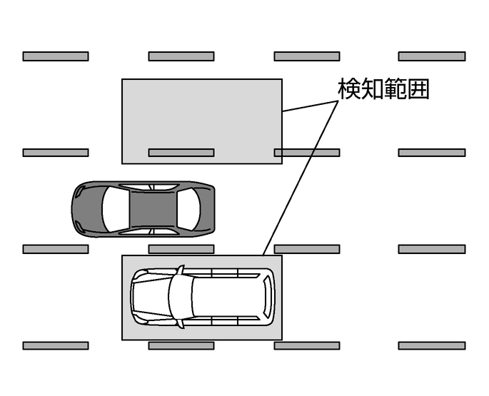 検知範囲は、自車両のドアミラーからリヤバンパーの後方約3m、車両の側面から横方向に約3mです。