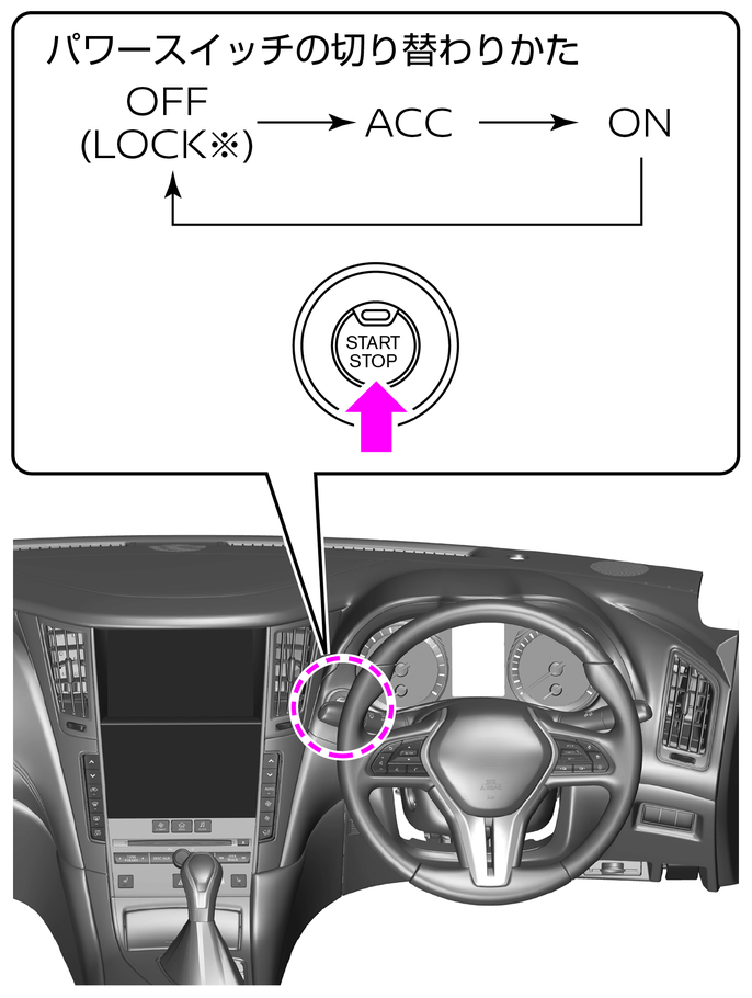 インテリジェントキーを携帯しているとき、ブレーキペダルを踏まずにパワースイッチを押すと電源ポジションが切り替わります。