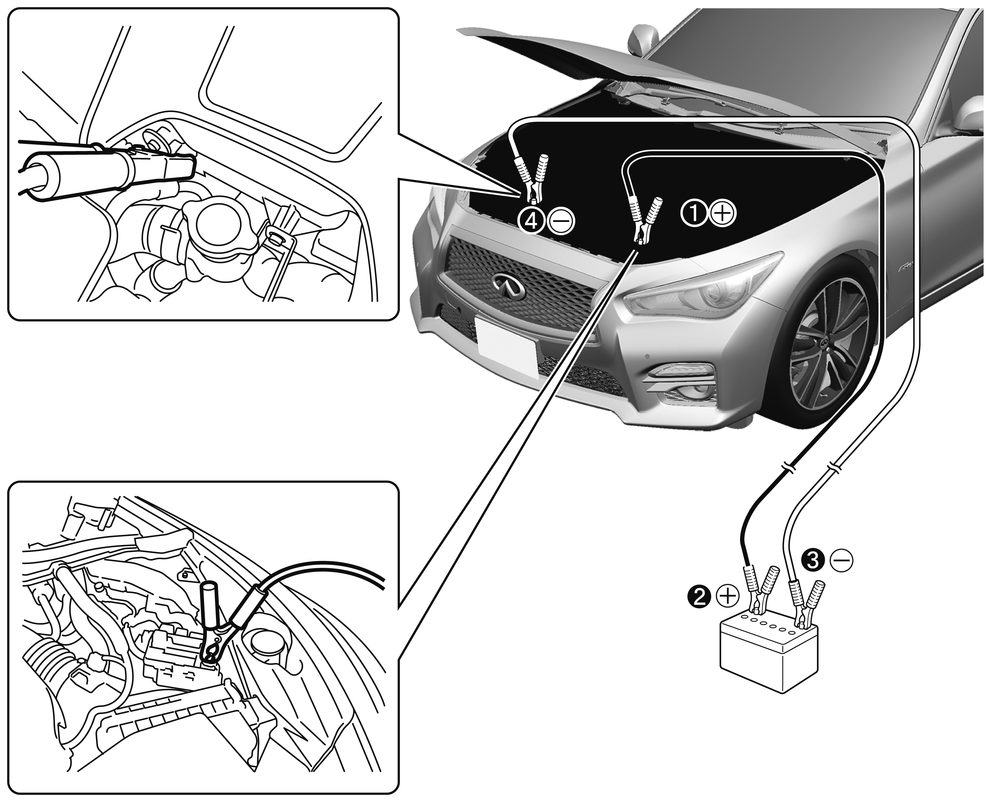 12Vバッテリーがあがり、ハイブリッドシステムの始動ができなくなったときは救援車を依頼し、ブースターケーブル(別売り)をつないで始動してください。