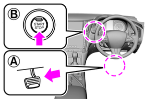 ブレーキペダル(A)をしっかりと踏みながら、パワースイッチ(B)を1回押します。