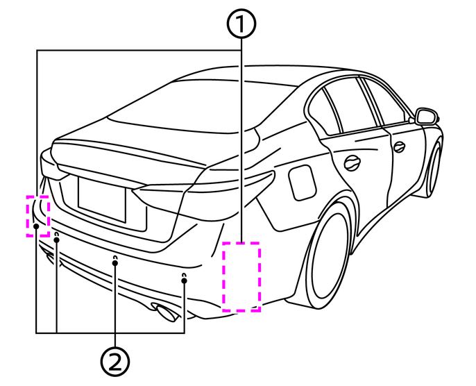 インテリジェント BUI(後退時衝突防止支援システム)は車両後部に取り付けられたレーダーセンサー(1)により、後方を横切ろうとする車両を検知します。また、リヤバンパーに取り付けられたソナー(2)により、後方の障害物を検知します。