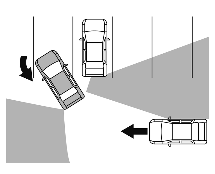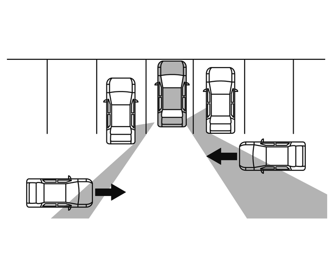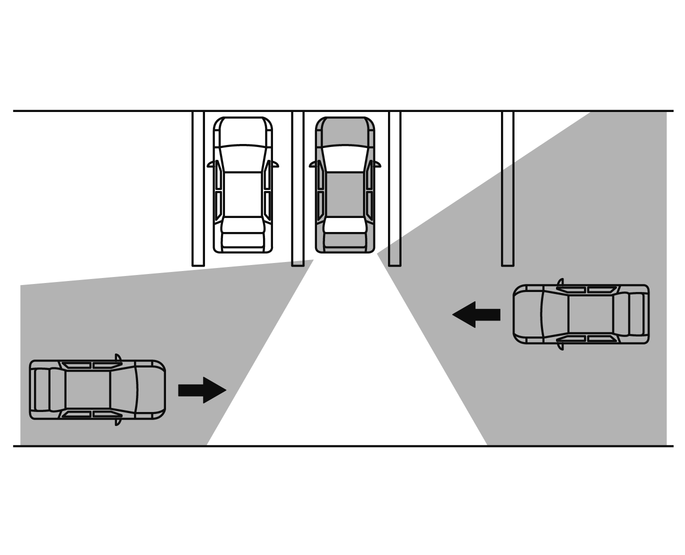 インテリジェント BUI(後退時衝突防止支援システム)は、運転者の代わりに周囲を確認したり、車両や障害物との接触を防ぐ機能ではありません。駐車スペースから後退するときは、機能に頼った確認をせず、必ず運転者自身で周囲の安全を確認してください。