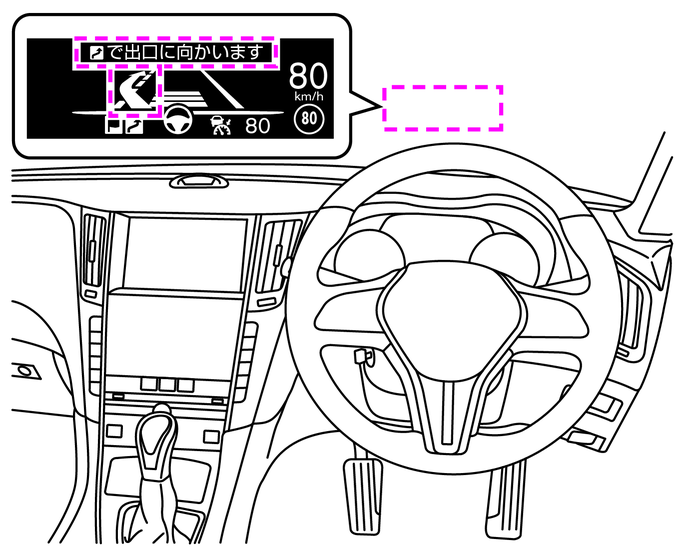 運転者がナビゲーションシステムで目的地を設定している場合、ナビゲーションのルートに従って走行するために必要な車線変更地点に到達すると、表示により運転者に車線変更を提案します。