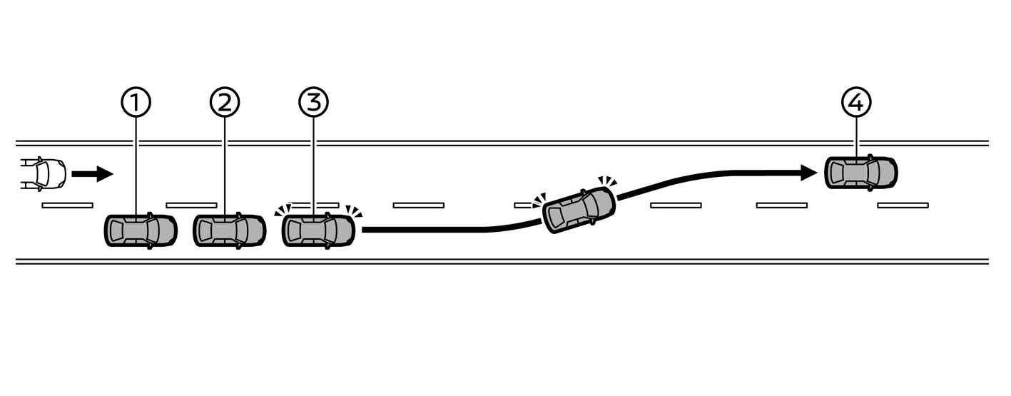目的の車線に車線変更のスペースを検出すると、車線変更支援作動表示が緑色で点滅するとともに方向指示器が作動し、その後ステアリング制御により目的の車線への移動を支援します。