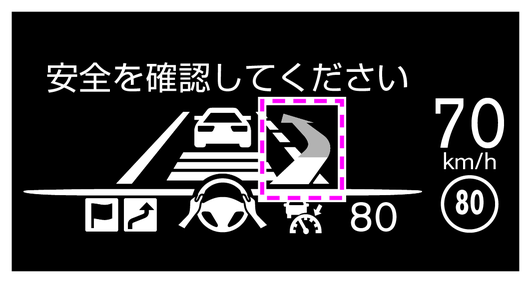 を押すと、車線変更支援作動表示が白色でアニメーション表示され、最大約10秒間、目的の車線の車線変更スペースの検出を行います。