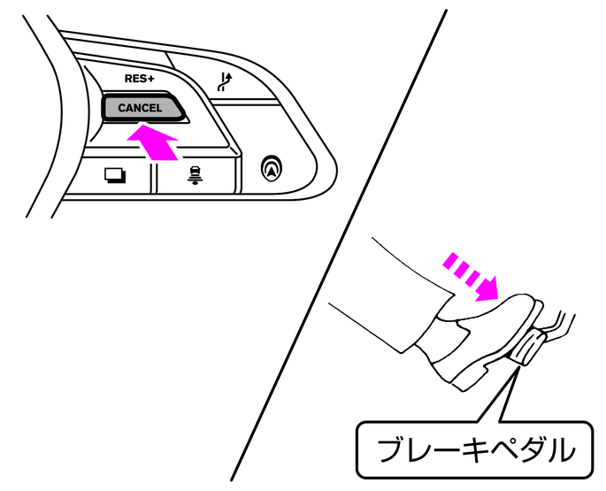 解除前の設定車速で再び開始したいときは、RES+スイッチ(上押し)を押します。