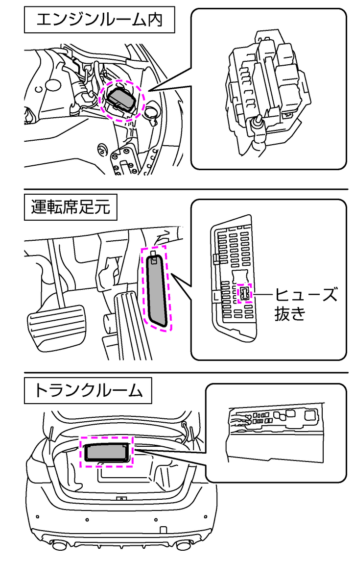 各ヒューズの位置はエンジンルーム、運転席足元はヒューズボックスのふたの裏側、トランクルームはふたの表側に表示してあります。