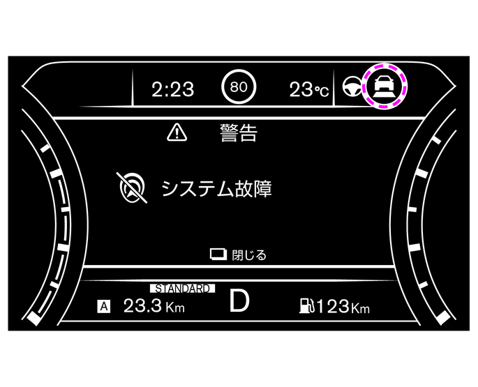 車速・車間制御機能に異常があると、警告音とともに車速・車間制御警告灯(オレンジ)が点灯し、アドバンスドドライブアシストディスプレイに「システム故障」と表示され、車速・車間制御機能は自動的に停止します。