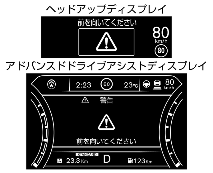 プロパイロット2.0の表示が青色のとき、運転者が前方の状況に注意していないと判断した場合、前方の状況に注意するよう音、表示により警告をします。