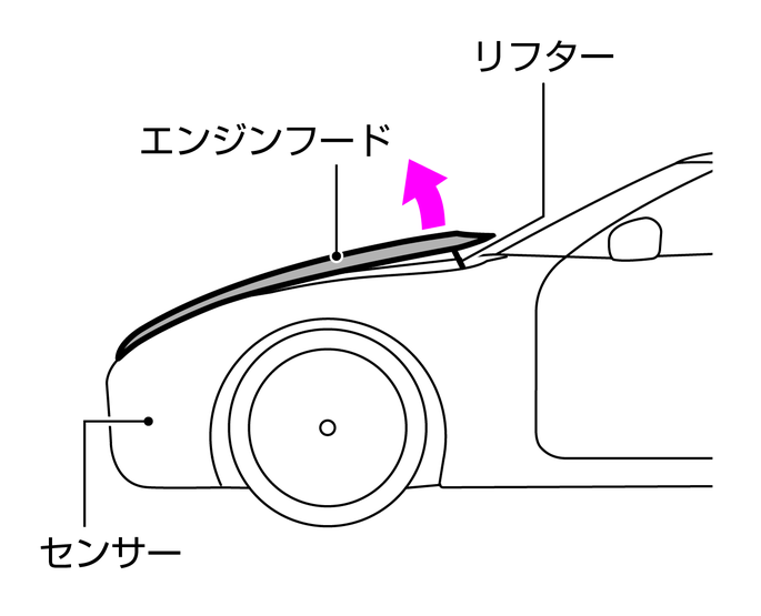 衝突によりセンサーがある一定以上の衝撃を感知すると、システムが作動し、リフターによりエンジンフードの後端が瞬時に持ち上がります。