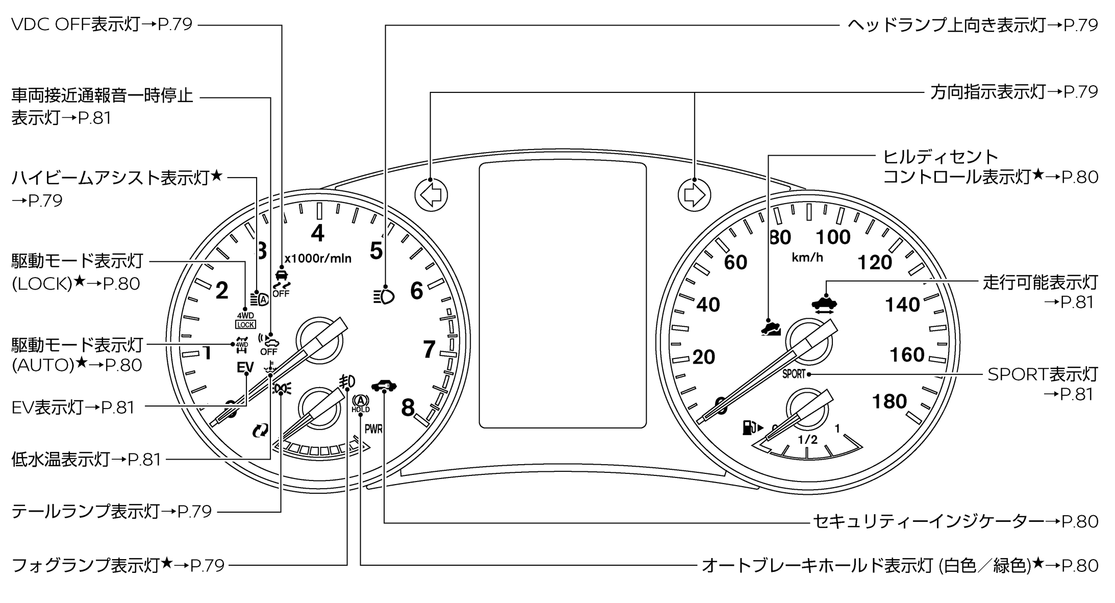 次のイラストは、説明のためすべての表示灯を表示しています。