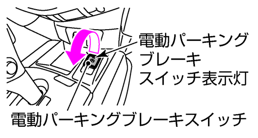 スイッチを引き上げると、電動パーキングブレーキスイッチの表示灯とメーター内の電動パーキングブレーキ警告灯(赤色)が、約2秒後に点灯します。
