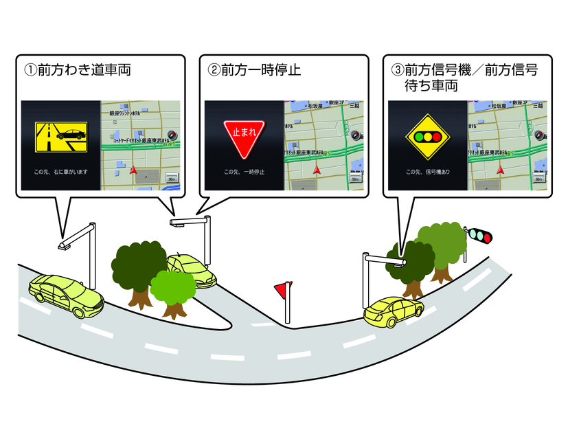 出合い頭・一時停止・信号機・信号待ち車両の注意ガイドの表示を設定できます。この機能は、VICS(ビーコン)対応キット◎の接続が必要です。道路上にDSSS(Driving Safety Support Systems)用の光ビーコンが設置されている場合に、出合い頭、一時停止、信号機および信号待ち車両の情報を受信すると、走行状況や交通環境に応じて必要性を判断し、音声と画面表示で注意ガイドをします。注意ガイドの必要性は、ナビゲーションシステムで判断しているため、必ずしも常にガイドするものではありません。