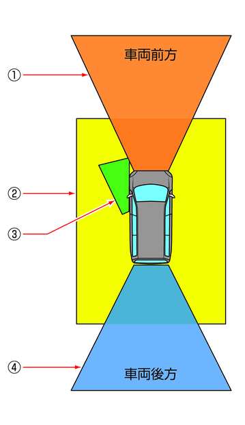 カメラの映し出す範囲の境界線上にあるもの、路面より高さのあるものが映らない場合があります。