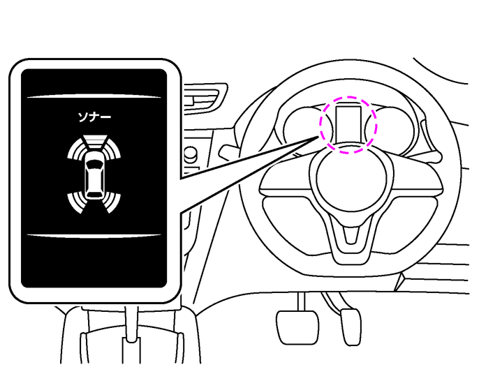 車両が障害物に近づくと、メーター内ディスプレイのソナー表示色が緑 → 黄 → 赤の順に切り替わり、警報音が鳴ります。