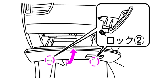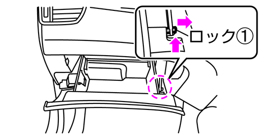 グローブボックスを5cm程度開けた状態にし、下側のロック(2)を外します。